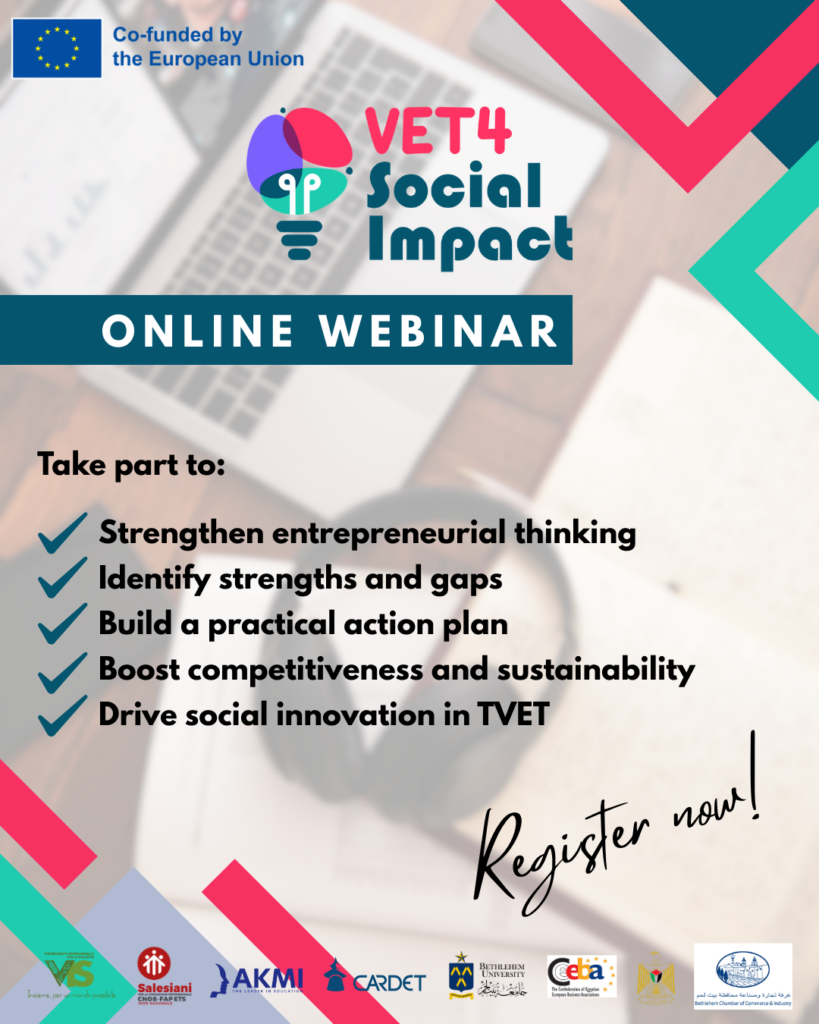 The VET4Social Impact project is launching a new phase of its capacity-building journey through an online webinar dedicated to the institutional self-assessment process, a practical step designed to support TVET institutions in Egypt and Palestine in strengthening their entrepreneurial orientation and social innovation capacity.